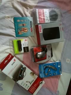 Anti virus software, cooler fan, mouse, Sony 8gb thumbdrive, portable speakers, ear piece, and 2 laptop bags.